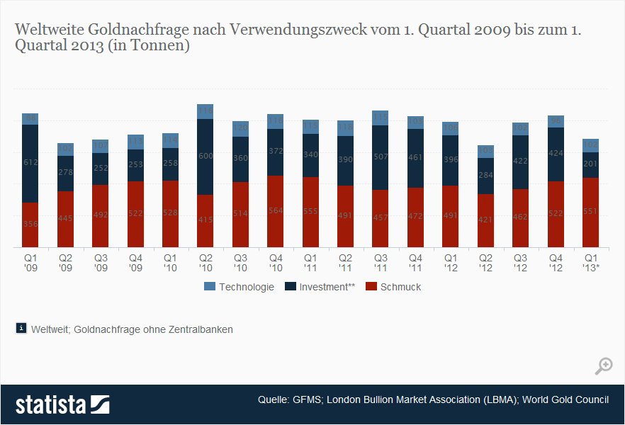 Die Statistik zeigt Quartalszahlen zur weltweiten Goldnachfrage im Zeitraum der Jahre 2009 bis 2012 unterteilt nach dem Verwendungszweck. Die Nachfrage nach physischem Gold ist größer als das Angebot über die Minenproduktion. Das Gleichgewicht wird durch Wiederaufbereitung (scrap) und auch zu einem großen Teil von Zentralbankverkäufen hergestellt. Im vierten Quartal 2012 belief sich die weltweite Goldnachfrage insgesamt auf etwa 1.196 Tonnen (Angaben inklusive Ankäufe des öffentlichen Sektors), die Nachfrage nach Gold zur Herstellung von Schmuck lag bei rund 525 Tonnen.