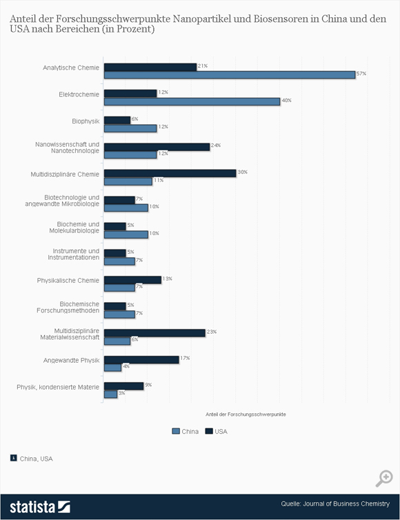 Dargestellt ist der Anteil der Forschungsschwerpunkte Nanopartikel und Biosensoren in China und den USA im Vergleich nach Bereichen. Im Bereich Analytische Chemie beträgt der Schwerpunktanteil in China 57 Prozent.