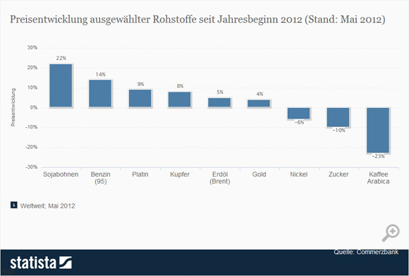 Die vorliegende Statistik zeigt die Preisentwicklung ausgewählter Rohstoffe in der ersten Hälfte des Jahres 2012. Von Jahresbeginn bis zum Mai 2012 sank der Preis für Arabica Kaffee um insgesamt 22 Prozent.