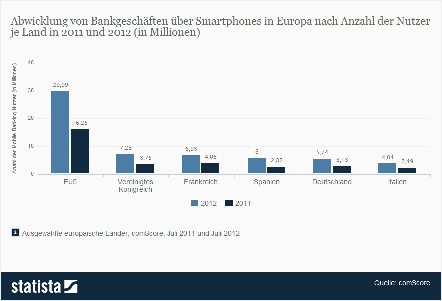 Die vorliegende Statistik bildet den Anteil von Smartphone-Banking in führenden europäischen Märkten im Juli 2012 ab. Im Vereinigten Königreich erledigten im Juli 2012 7,28 Millionen Smartphone-Besitzer ihre Bankgeschäfte über mobil.