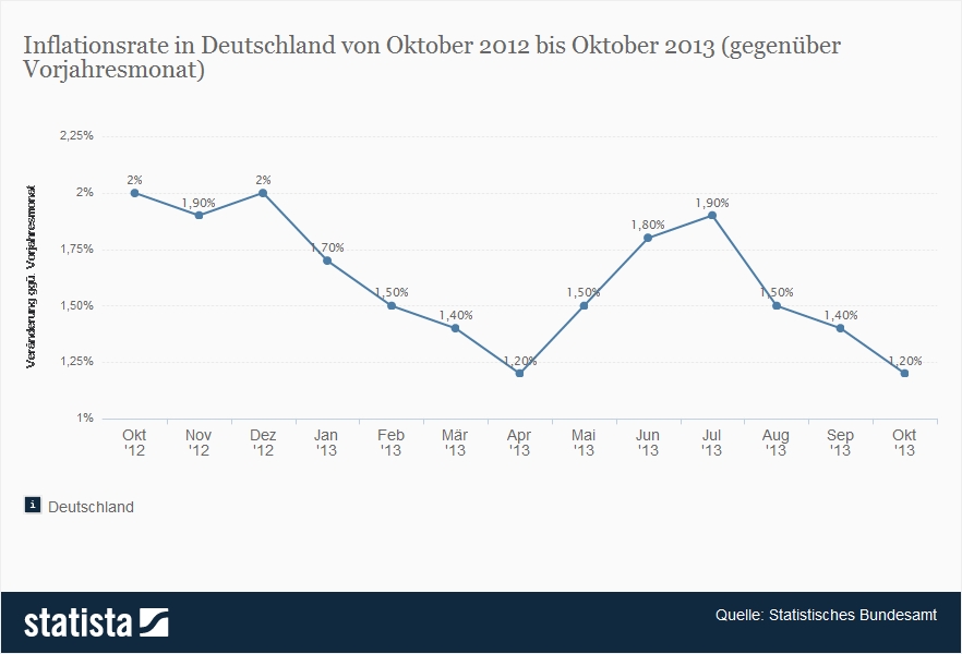 Die Statistik zeigt die aktuelle monatliche Inflationsrate in Deutschland von Oktober 2012 bis Oktober 2013. Im Oktober 2013 sind die Verbraucherpreise in Deutschland um 1,2 Prozent gegenĂŒber dem Vorjahresmonat gestiegen.