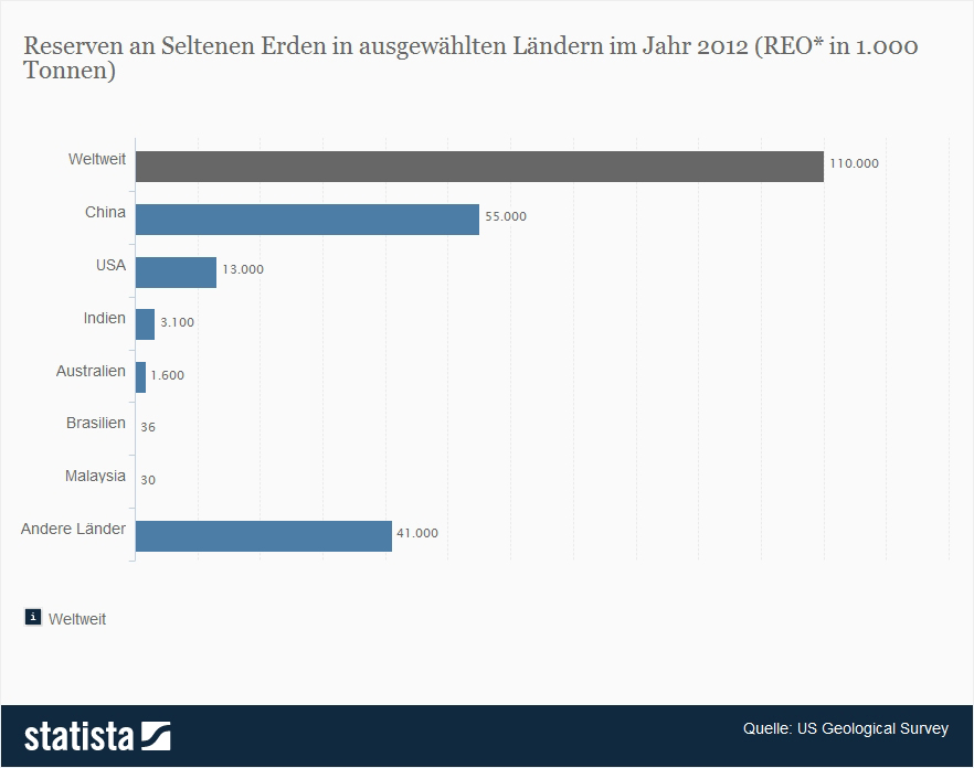 Weltweit beliefen sich die Reserven an Seltenen Erden 2012 auf rund 110 Millionen Tonnen.