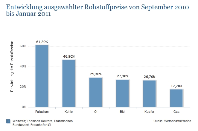 60 Prozent des Bedarfs an Palladiums kommt aus der Automobilbranche. Auch für die Medizintechnik und Elektroindustrie ist Palladium aufgrund seiner chemischen Eigenschaften ein wertvoller Rohstoff. In den vergangenen Tagen stieg der Palladium Preis von 608 auf 632 Dollar je Feinunze. Und der Preis pro Unze könnte sich laut Einschätzung von Analysten im Jahr 2013 noch weiter auf bis zu 800 Dollar erhöhen. Für 2015 seien sogar 925 Dollar pro Unze möglich.